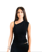This asymmetric top is a statement piece with a twist—literally. Featuring a striking twist detail on one shoulder, it offers a unique and eye-catching design. The silhouette is cinched at the waist, enhancing your natural curves and giving it a fitted, feminine feel. The one-shoulder style adds a touch of modern sophistication, while the soft fabric ensures all-day comfort. Perfect for both casual and dressier occasions, this top effortlessly blends elegance with a contemporary edge.
